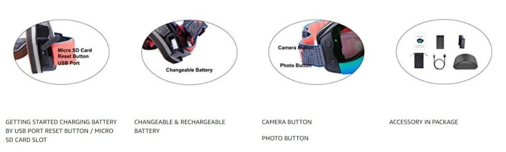 Model 4K Ultra Video Ski-Sunglass Goggles Function 4K Ultra video Camera + Taking Photo Sensor Wide angle 142 degree OV5653 CMOS sensor Video Image Resolution 2880×2160 at 24fps 4K Max Photo Image resolution 4608X3456 at 16M Pixel Playing Speed 30fps Using environment Outdoor External memory card Support external memory Product size (folded) 17×3.5×10 cm Product weight (Net) 160G Frame material TPU Lenses Colorful double Lens for Ski USB MINI 8Pin Power source 1050mAh (AA size) / Changable and Rechargable Battery Type Rechargeable lithium-ion polymer,charged via USB connection Battery life Video recording ≥180 Minutes; Power adaptor 5V DC/ 1050mAh Power consumption <0.8W Player Software Windows Media Player, Real player,Stormcodec