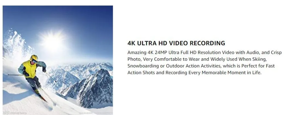 4K 24MP Professional video quality 4K Camera Ski Goggles Capture Crisp and Clear Full HD Video. Keep Your Hands Free while You Record all of Your Sporting Adventures whether it is Skiing, Rock Climbing, Skateboarding, or Motorcycle Sports.Which is Perfect for Capturing Fast Action Shots with Fluid motion. The Video Recording Video Goggles Captures a Wide Field of Vision, it can Capture more of What Your Eye Sees. The Camera Feature Advanced Image Stabilization which Enables You to Record Action Shots with Nice Smooth Video.