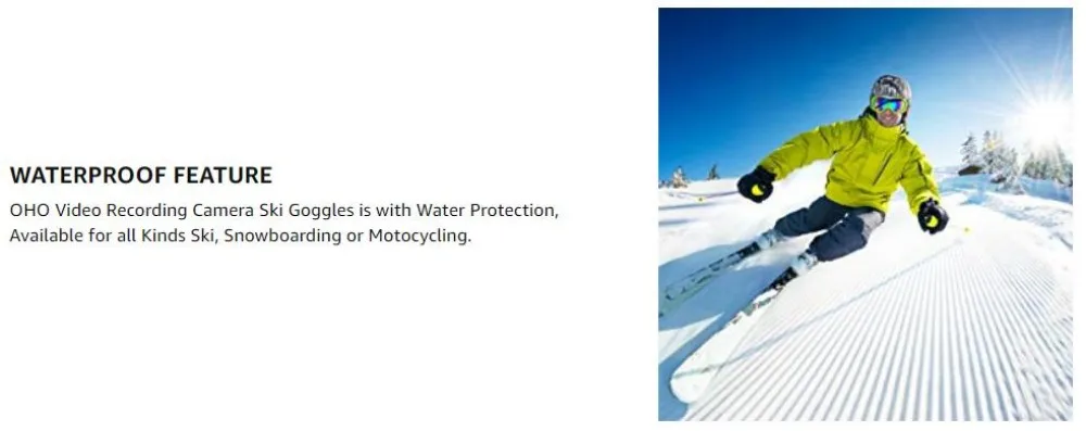WiFi 4K LIVE STREAMING FEATURE: Live Streaming Video from Goggles to Mobile Phone by APP (Android & iOS). You Can Playback or Download Videos & Photos from Goggles to Your Mobile Phone, and Share with Social Media. OhO Goggles Capture Ultra HD Crisp and Clear Photos and Videos. Come with 32GB Micro SD Card, Support Maximum 128GB Memory TWO BUTTONS OPERATION: One Button for Video Recording with Audio, One Button for Photo Taking with LED Indicator Light inside the frame. The Battery in Goggles and Spare Battery is All Changeable and Rechargeable. IMPACT RESISTANT FRAME: The Goggle Collection is Driven by Adventure. And That is Why We Have Developed a Line That is Designed to Go Beyond Everyday Boundaries. In The Harshest Conditions, When Everything is on The Line, We Know that Having a Trusted, Quality and Durable Goggle is Paramount. HELMET COMPATIBLE: Very Comfortable to Wear and Compatible with Helmet, a Double Beading Layer of Silicon Coats Each and Every Goggle Strap to Ensure that Beanie or Helmet, Your Goggle will Stay Exactly where You Place It VERY CLEAR ANTI-FOG LENS: All OhO Lenses Go Through a State-of-the-art Infusion to Ensure Your Vision is Never Compromised. Anti-Fog Molecules are Permanently Infused into the Lens Material so OhO Goggles Last Longer against the Elements. You Can’t Wipe it off – Even if you try